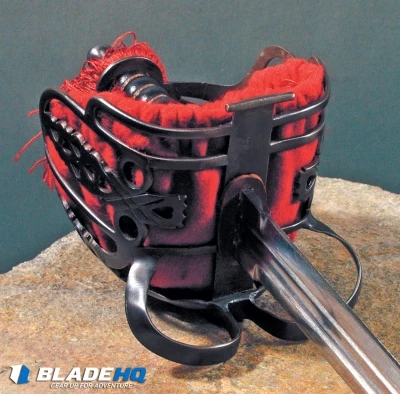 - Blued steel basket leather scabbard with blued steel fittings.
