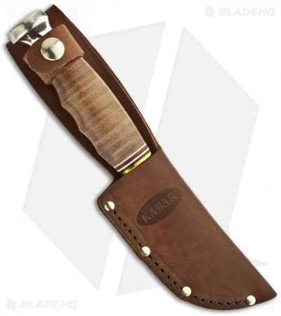 The 1234 Game Hook fixed blade is part of Ka-Bar classically styled Leather Handled Hunters. It features a polished stainless steel blade with hollow grinds and a gut hook. The brass guard and stacked leather handle are complemented by colored spacers and an aluminum pommel. Includes a brown leather KA-BAR sheath.