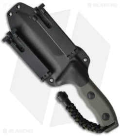 Extremely sturdy Microtech Crosshair fixed blade knife. Tried and true, this knife will hold up to some adverse conditions. The D2 tool steel blade is full tang, green finished and double edged. Both edges of the blade are plain. The handle is a green polymer with a braided lanyard and stainless steel “knocker” bead. Includes a heavy duty black Kydex sheath.