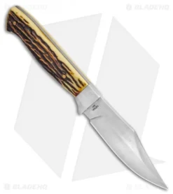 - Clip point fixed blade knife with stag handle.